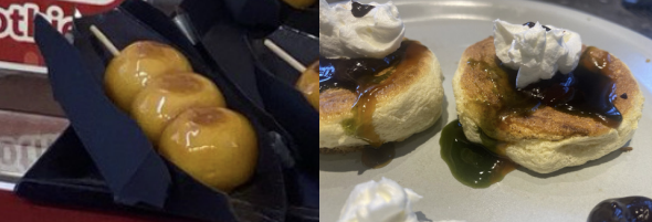 For sweets, rice is an essential staple in Japan, so many Japanese sweets are centered around that. They boil rice flour to make dumplings, and then coat/fill it with different toppings. I ate dango, which are rice dumplings covered in sweet soy sauce. Mochi is also pretty popular. It is made by steaming mochiko flour, and is then pounded until extremely stretchy. I ate matcha mochi and red-bean mochi.