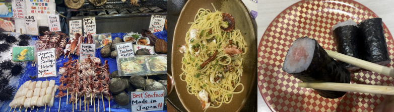 While walking around the street stalls, many shops were selling octopus. Seeing life octopus being handled so casually almost gave me a heart attack. I definitely was not going to eat live octopus, but we did visit a Japanese-style pasta restaurant. I ate octopus spaghetti, which had small chunks of it scattered, and it was delicious; 10 out of 10.